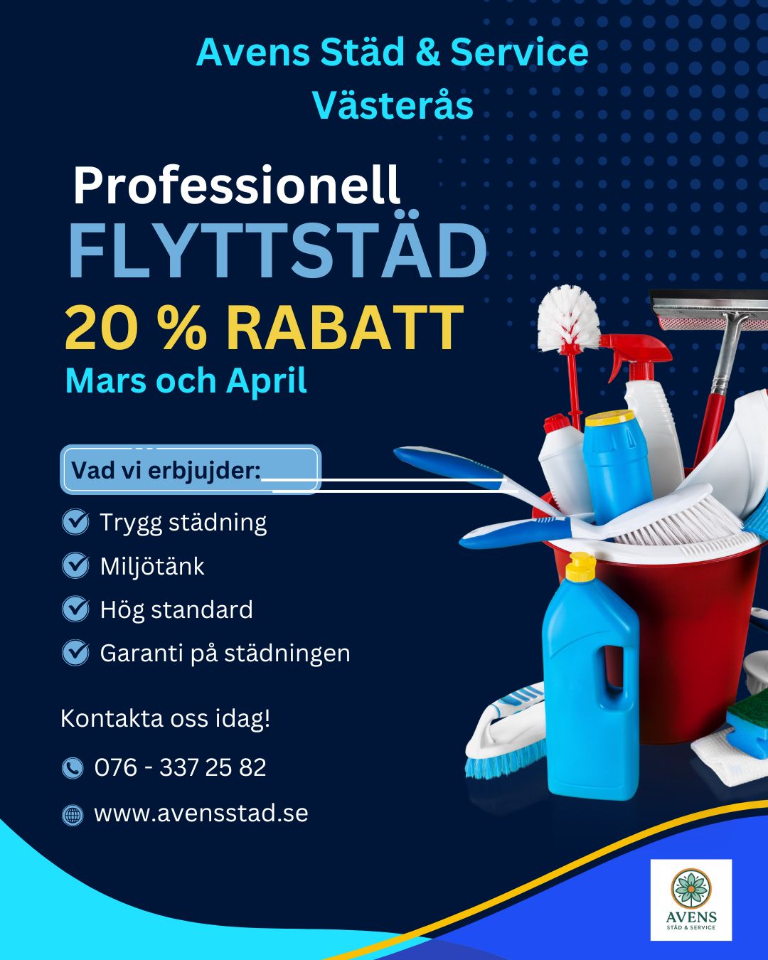 Mars och April erbjuder vi 20% rabatt på Flyttstäd, dödsbon(tömning och städ) och Hemstäd.